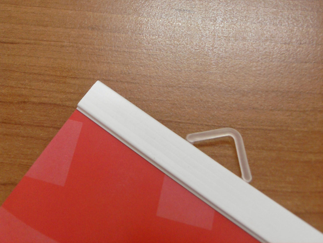 Профиль (планки) для плакатов № 11 изготавливается из поливинилхлорида (ПВХ) методом экструзии. Ушко № 11 изготовлено методом литья из полипропилена.