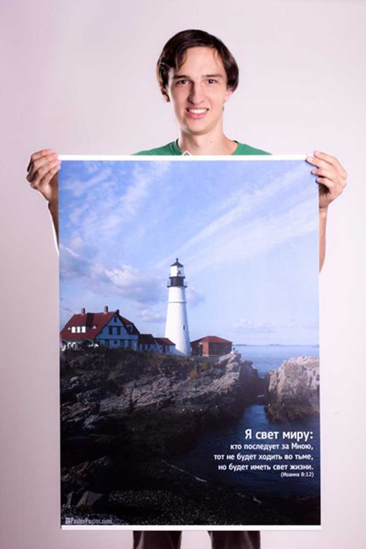 Размер плакатов — 62 на 88 сантиметра. К каждому плакату прилагаются две пластиковые планки (плакатный профиль № 11) и ушко для крепления на стене.
